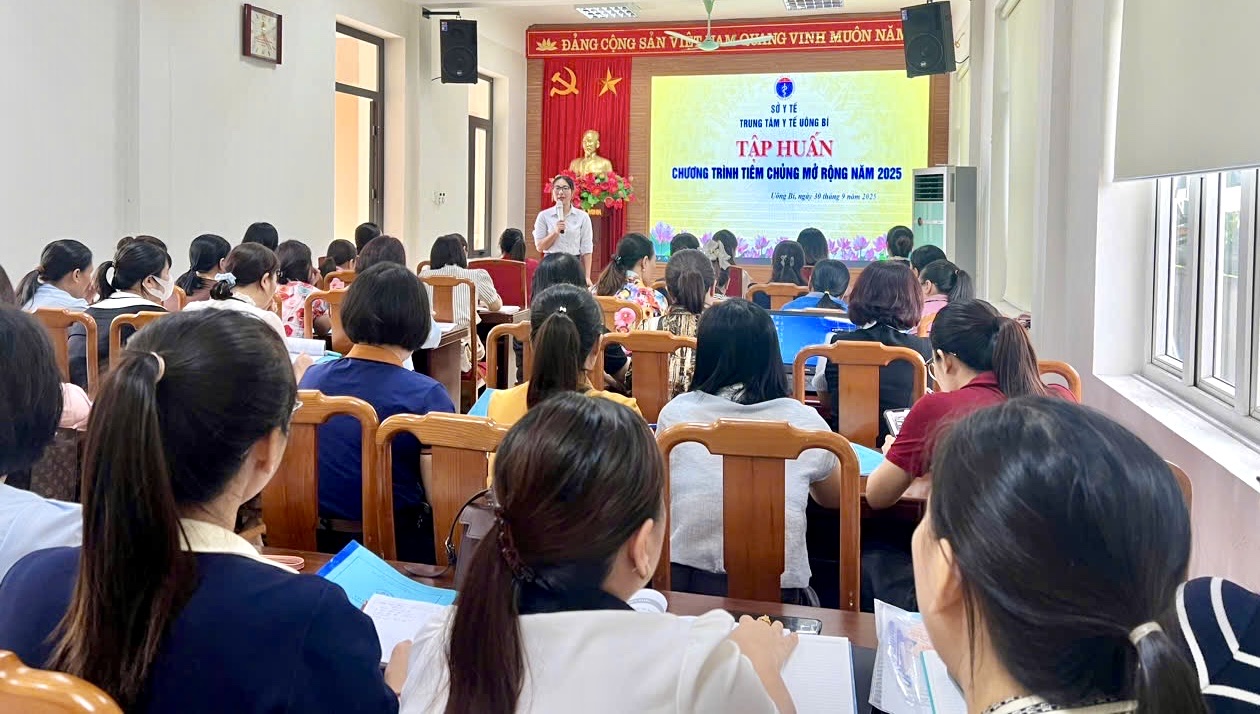 Ngày 30/9/2025, tại hội trường UBND phường Uông Bí. Trung tâm Y tế thành phố Uông Bí phối hợp với Trung tâm Kiểm soát bệnh tật tỉnh tổ chức lớp tập huấn chương trình tiêm chủng mở rộng cho hơn 50 người là các đồng chí của Phòng Văn hóa - xã hội phường Uông Bí, Vàng Danh, Yên Tử; Bệnh viện Việt Nam - Thụy Điển Uông Bí; Bệnh viện ĐKQT Hà Nội Quảng Ninh; Cán bộ phụ trách y tế học đường các trường tiểu học trên địa bàn; Khoa KSBT và các đồng chí Trạm trưởng, trạm phó, cán bộ chuyên trách tiêm chủng tại Trạm y tế xã, phường.
